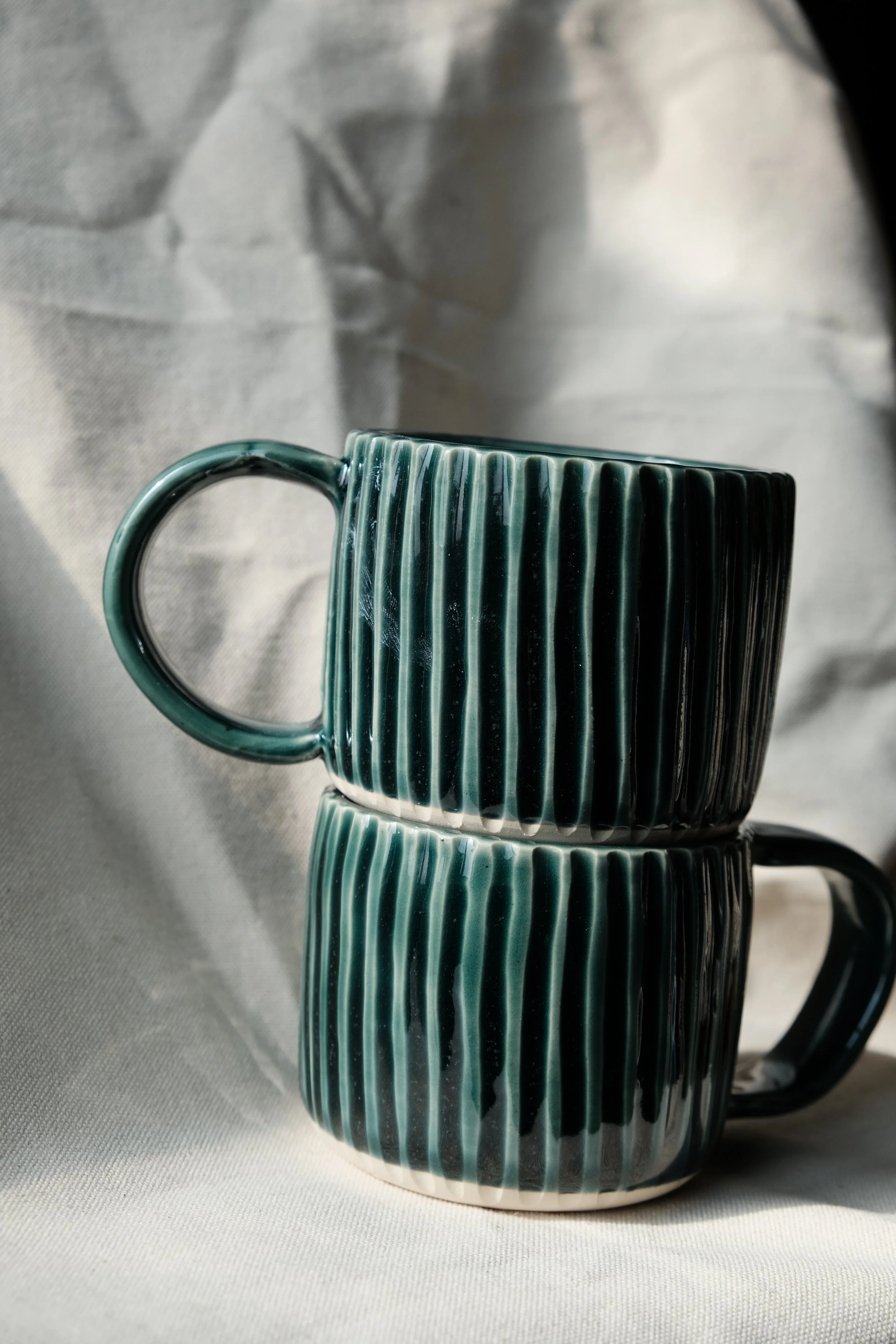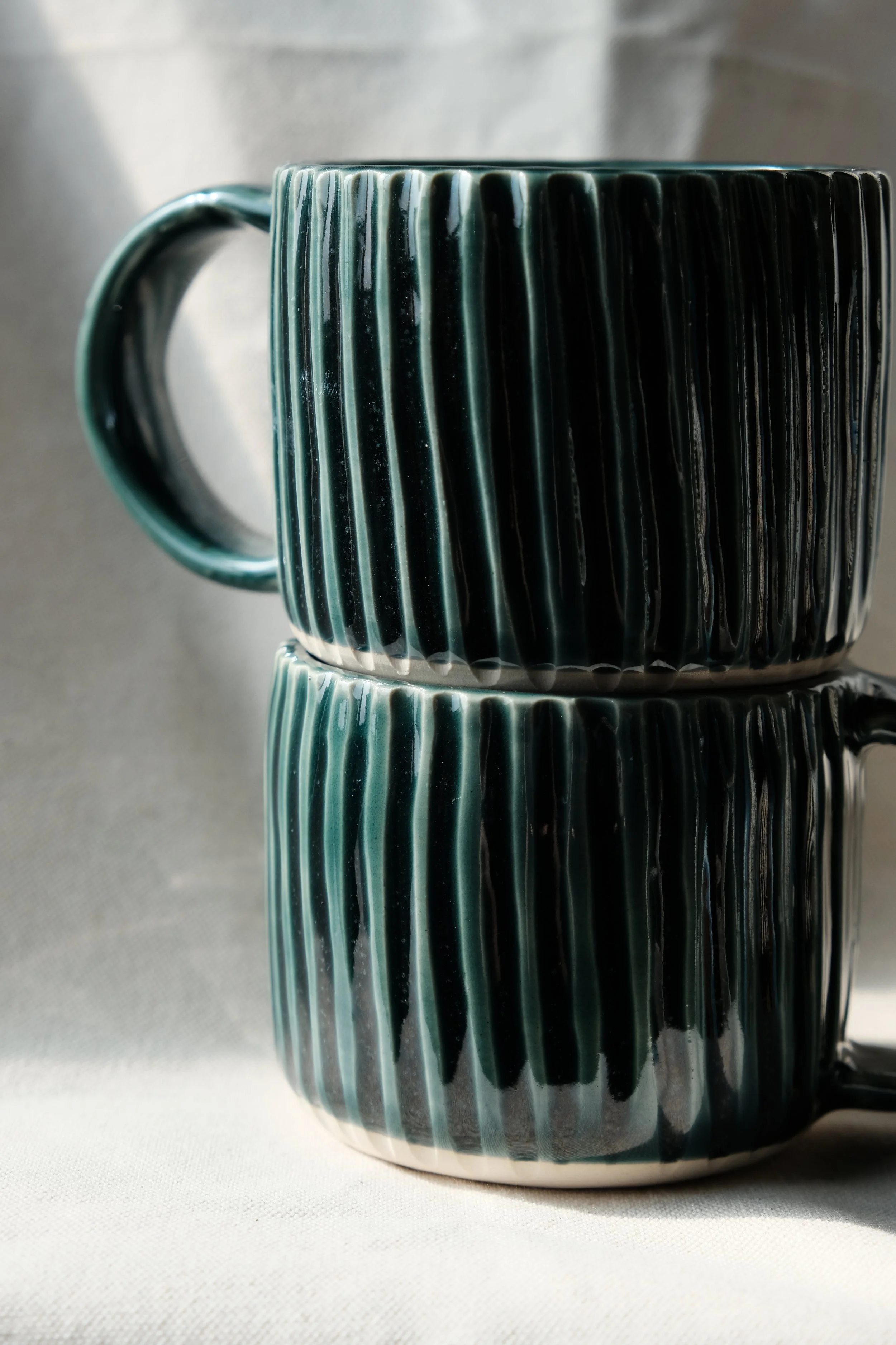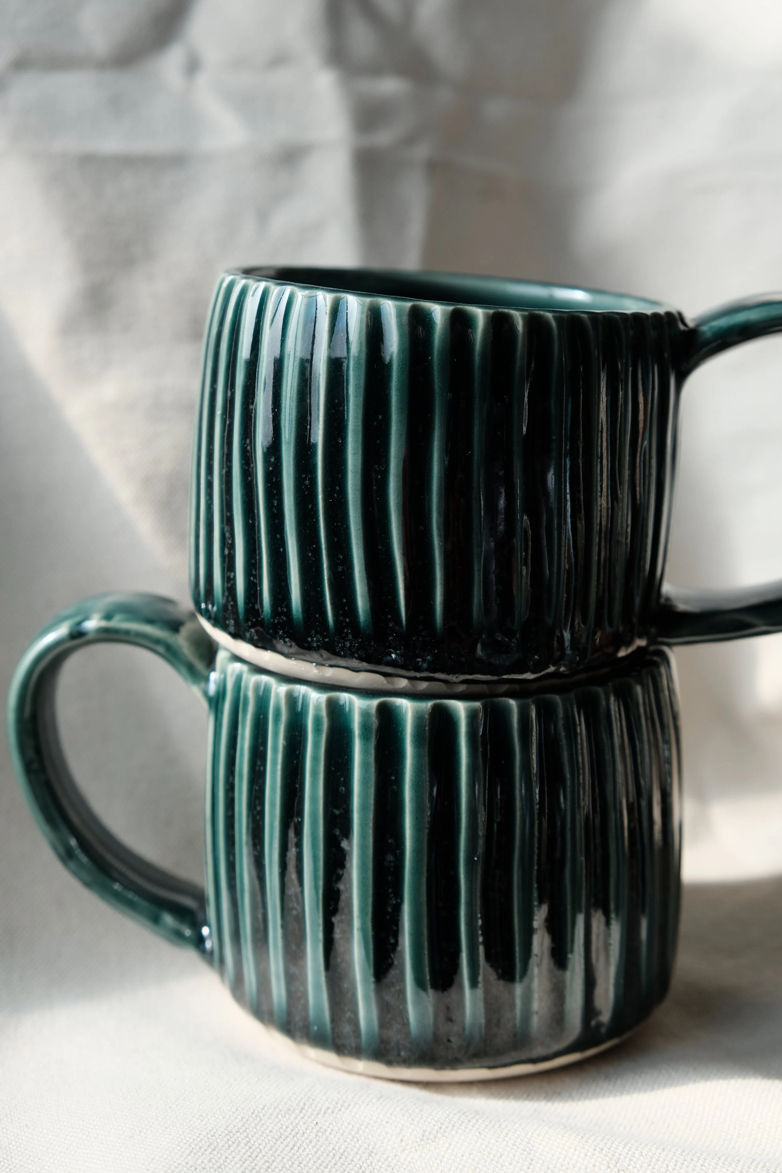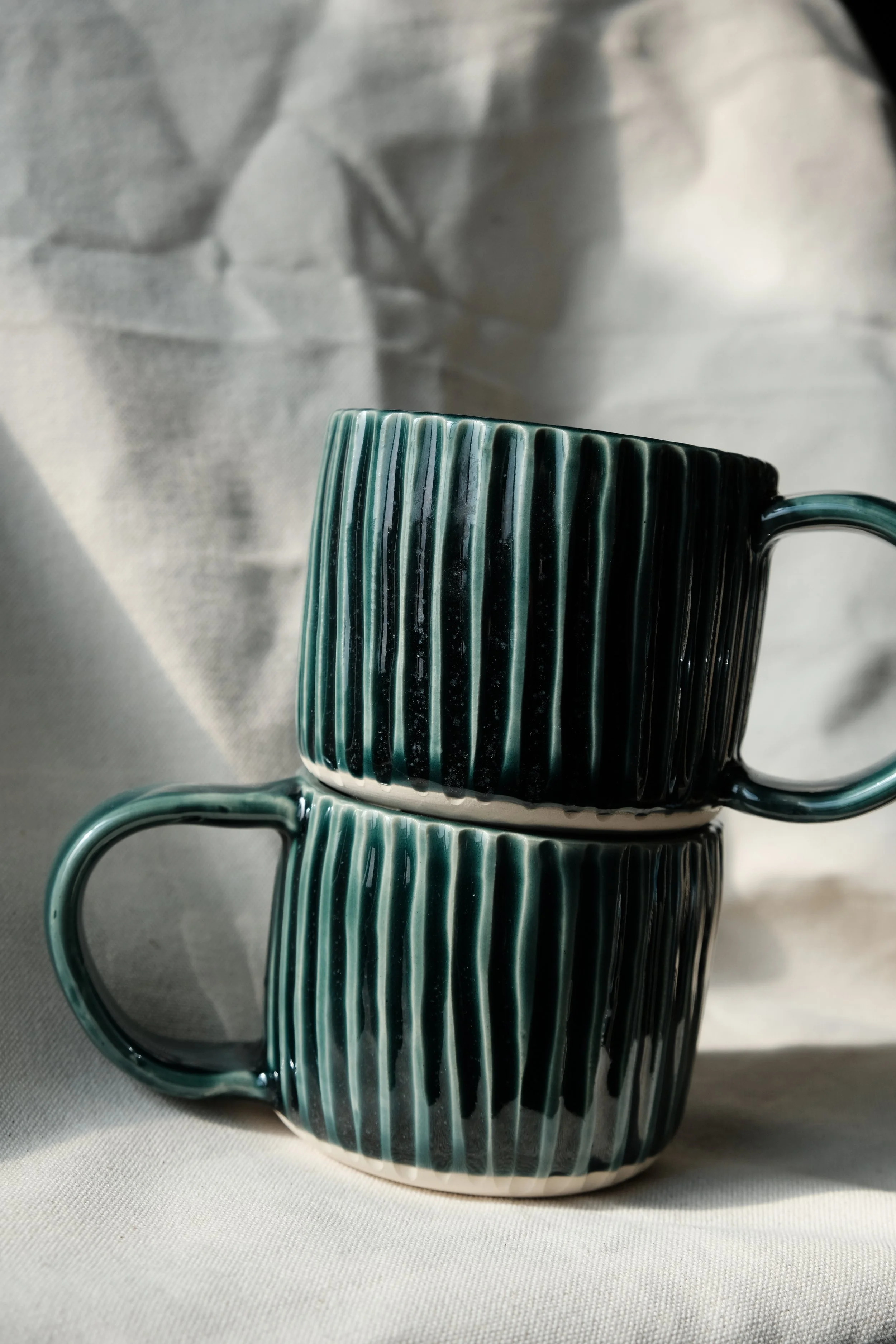 These emerald green cups are the perfect matching pair with a slight dimple for a thumb for a more comfortable grip. The green is a deep jewel tone and has a super glossy finish.