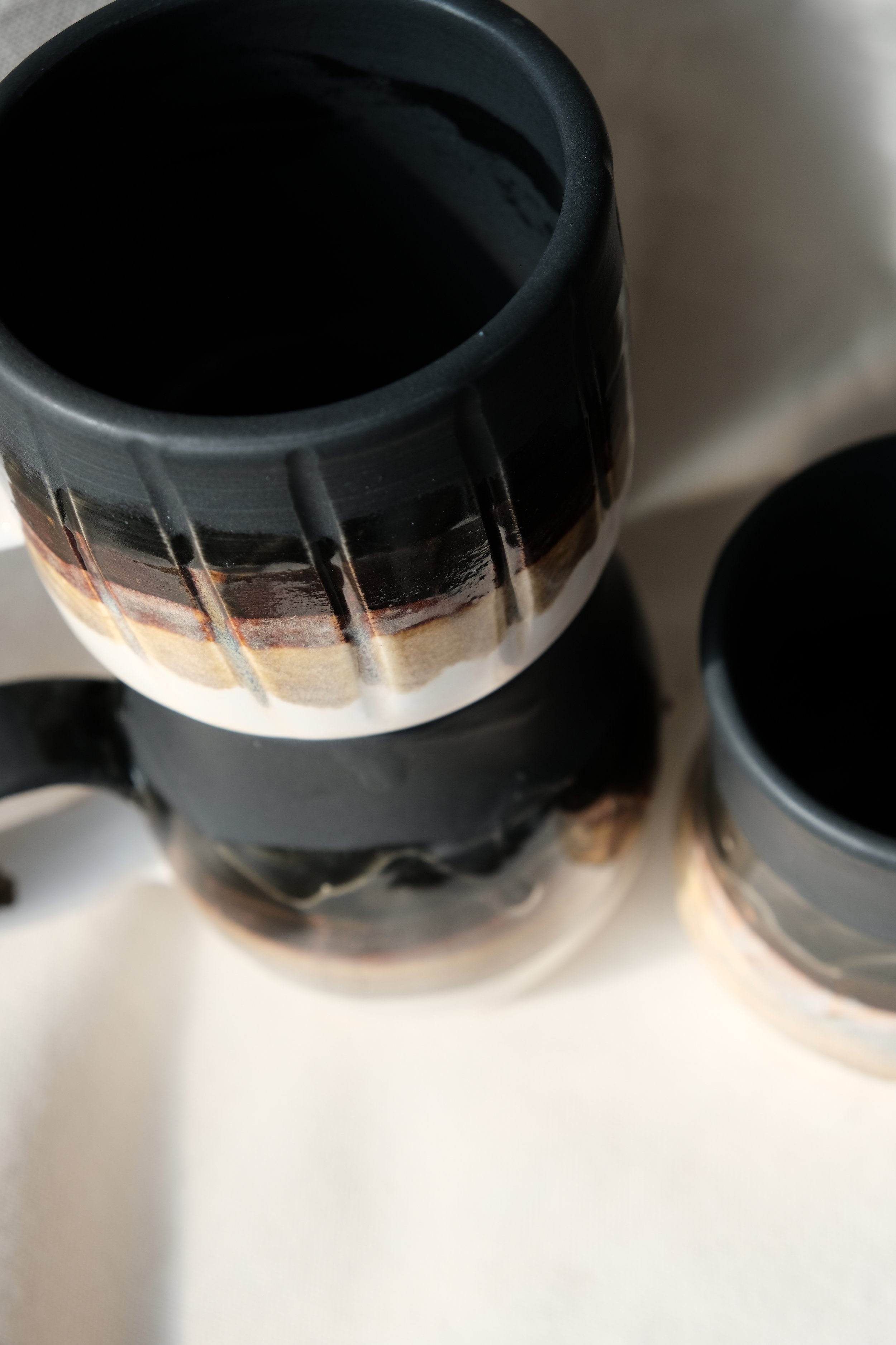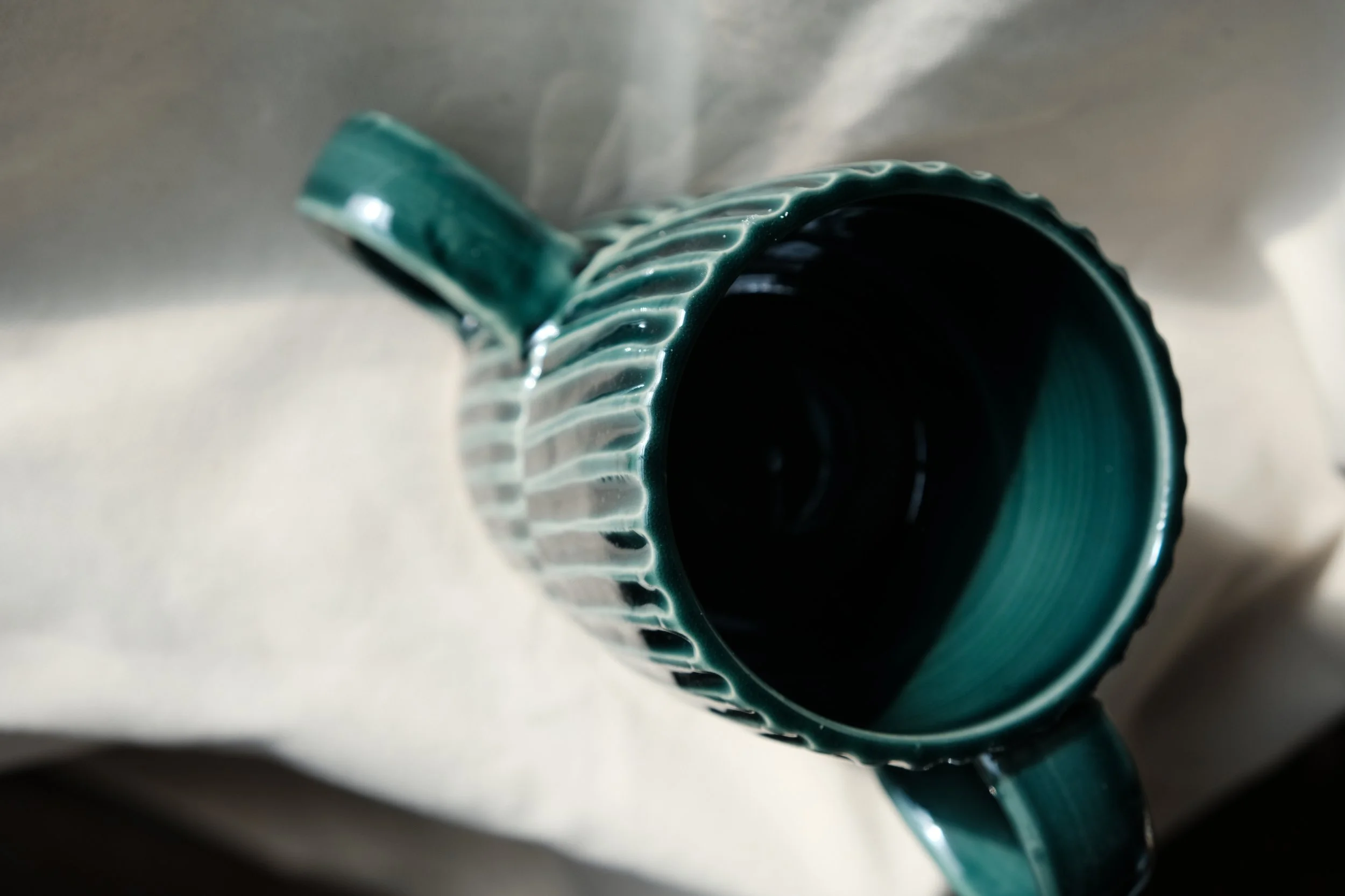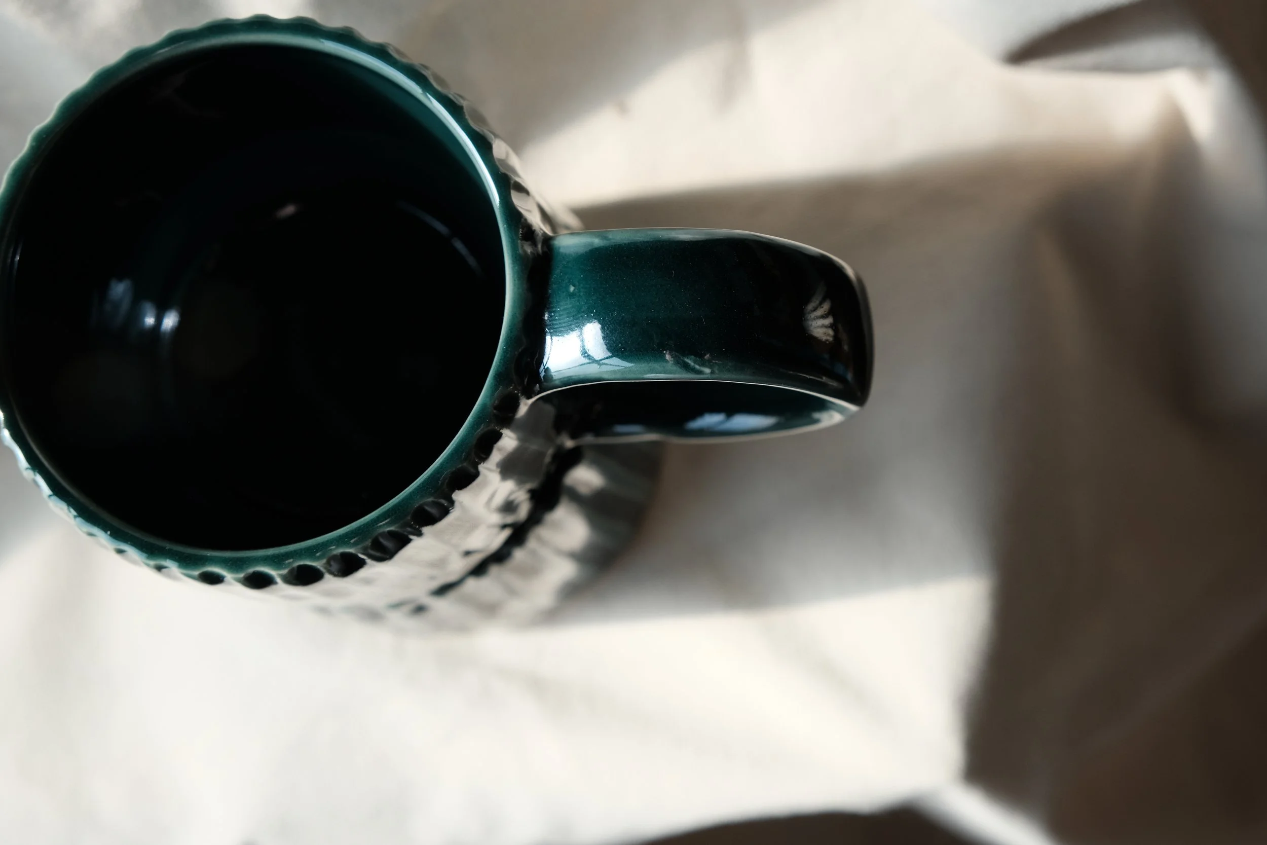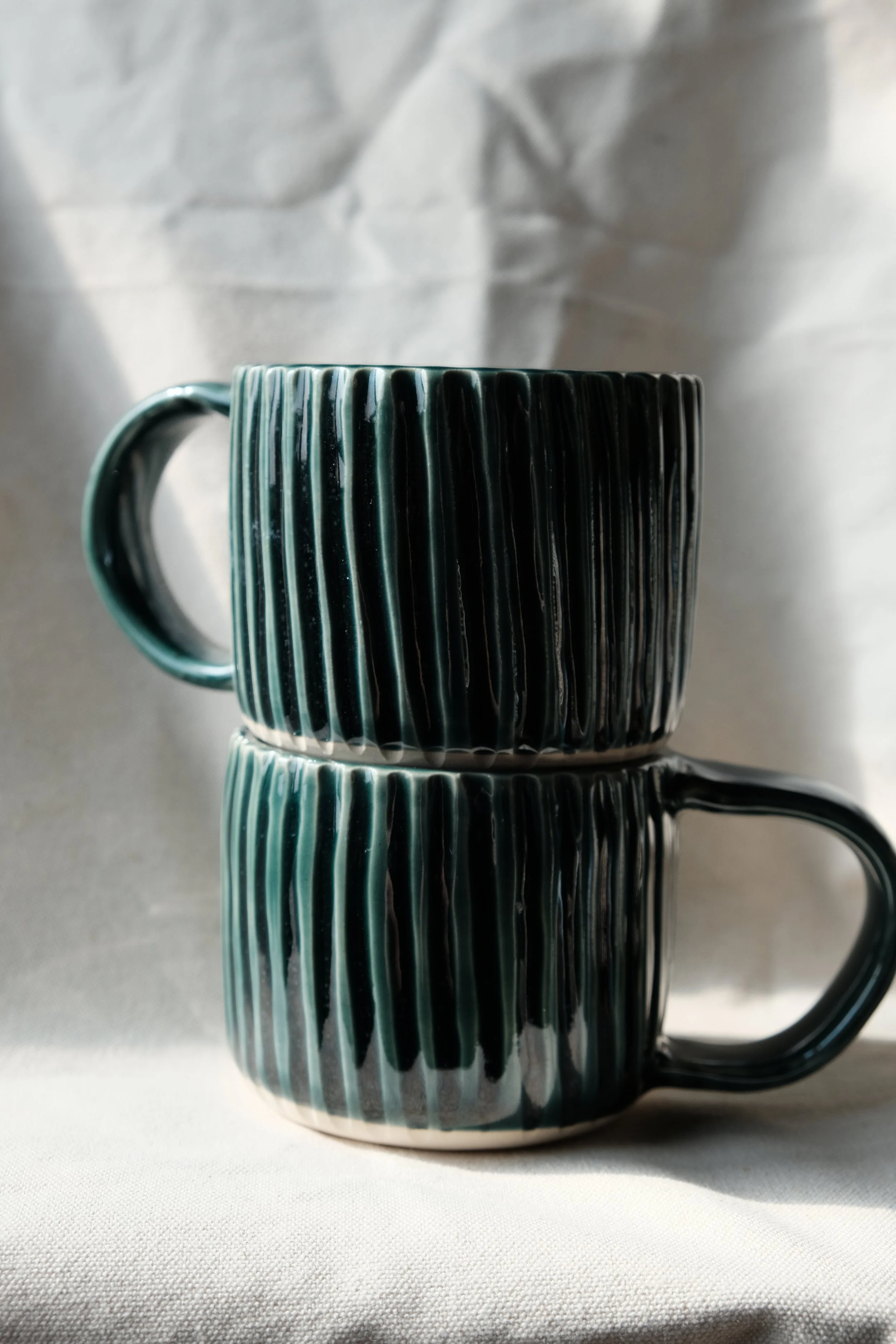 These emerald green cups are the perfect matching pair with a slight dimple for a thumb for a more comfortable grip. The green is a deep jewel tone and has a super glossy finish.