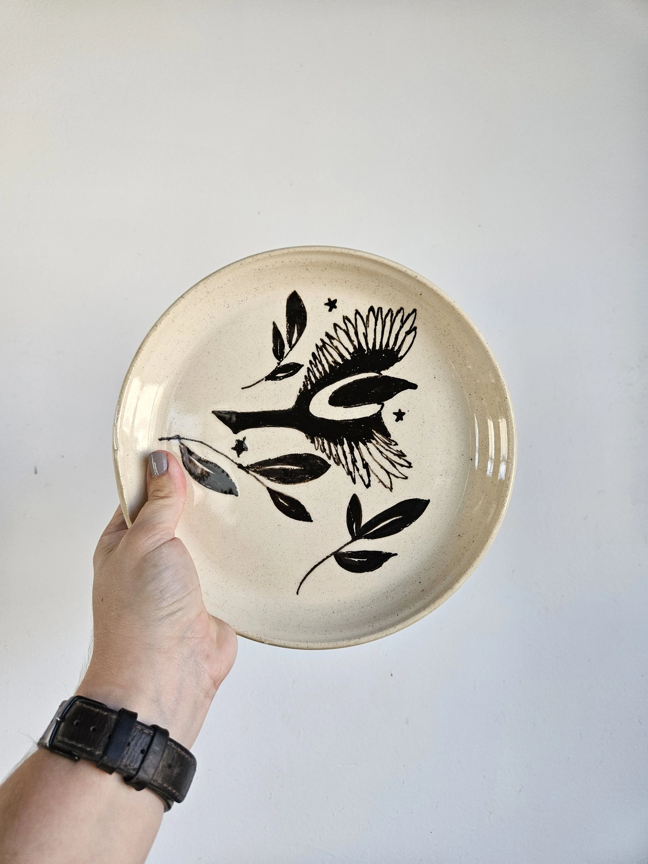 This 4 piece plate set showcases a hand-drawn illustration of magpies and floral elements in a classic black and white color scheme.